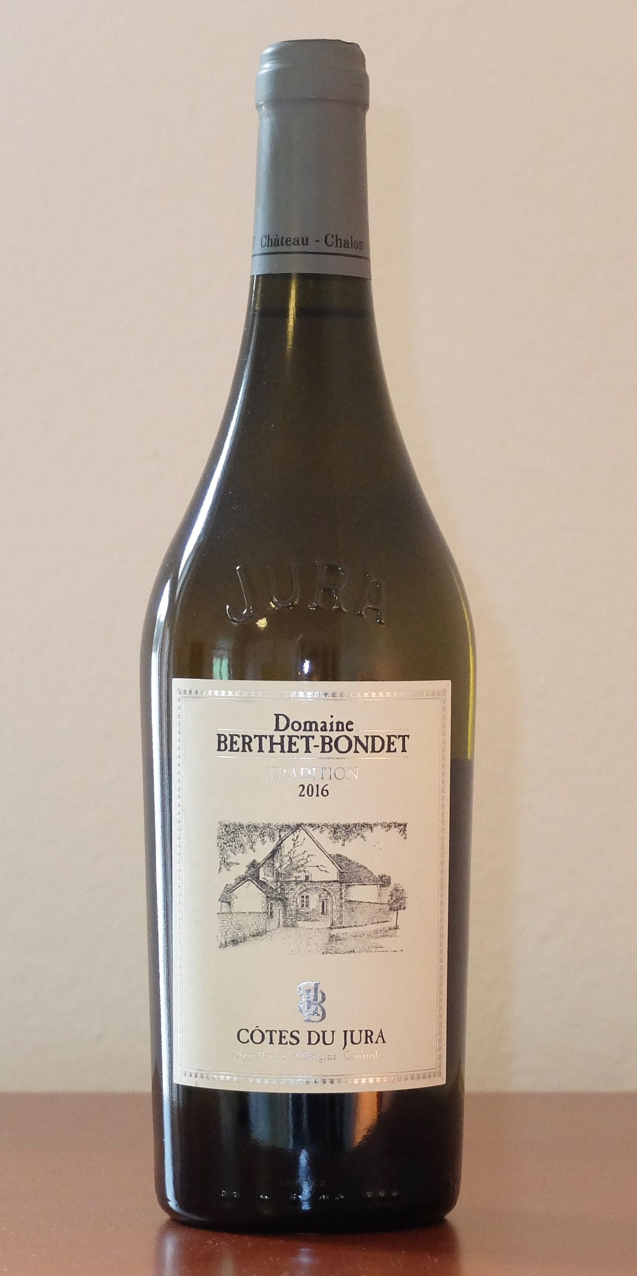 Der Berthet-Bondet Tradition non ouillés Côtes du Jura 2016 besteht zu 80 % aus Chardonnay und zu 20 % aus Savagnin. Die Trauben stammen aus weingutseigenen Weinbergen rund um Chateau-Chalon im Jura. Nach der selektiven Handlese wurden die Trauben im Ganzen gepresst. Danach wurde im Edelstahltank spontan vergoren. Nach der Gärung wurde der Tradition von Berthet-Bondet in 228l-Eichenfässer umgezogen, wobei diese nicht bis zum Spundloch gefüllt wurden. Damit gab man der Florhefe Gelegenheit zur Ausbildung und der Wein konnte "sous voile" für zwei Jahre reifen. Danach wurde ohne Filtration und Schönung mit etwas Füllschwefel gefüllt.